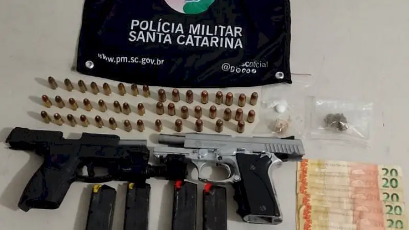 Dentro da residência, a Polícia Militar encontrou diversas substâncias ilícitas, sendo 4,36 gramas de crack, 0,65 gramas de cocaína e 0,60 gramas de maconha. Além das drogas, foram apreendidos 165 reais em espécie e três aparelhos celulares, que passarão por perícia. As armas encontradas, duas pistolas – uma calibre 9 mm e outra calibre 40 – estavam carregadas com munições.
