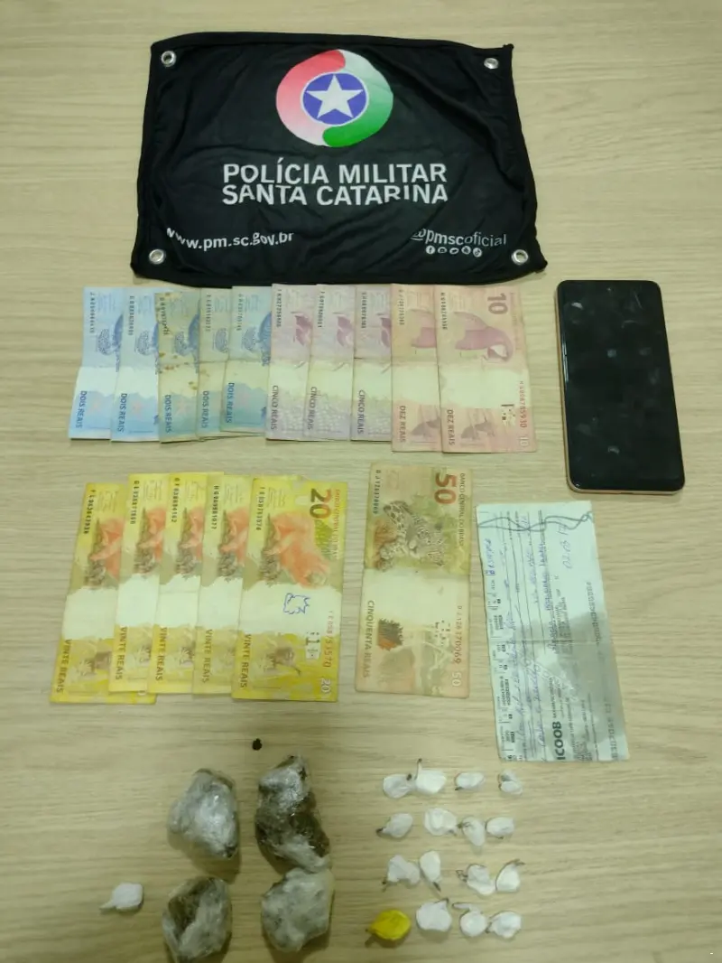 No local, foram abordados uma mulher e um homem que são moradores da residência. Ao serem informados de seus direitos, a mulher preferiu permanecer em silêncio, enquanto o homem disse ser usuário e indicou a presença de uma pequena porção em sua posse. Porém, durante a busca, foram encontradas duas porções de maconha nos fundos de um galpão. No interior da residência, com o auxílio do cão de faro Argo, foram localizadas diversas porções de maconha e cocaína, prontas para venda, além de valores em espécie e um cheque bancário. Diante dos fatos, as drogas foram apreendidas, sendo realizados os procedimentos cabíveis.