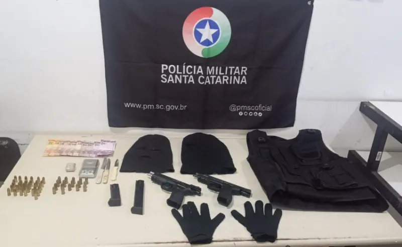 Durante os trabalhos, por volta das 19h45, foram encontradas uma pistola calibre .9mm com 31 munições, um carregador prolongado, uma pistola calibre .40 com 17 munições, além de duas toucas balaclava e uma capa de colete balístico.