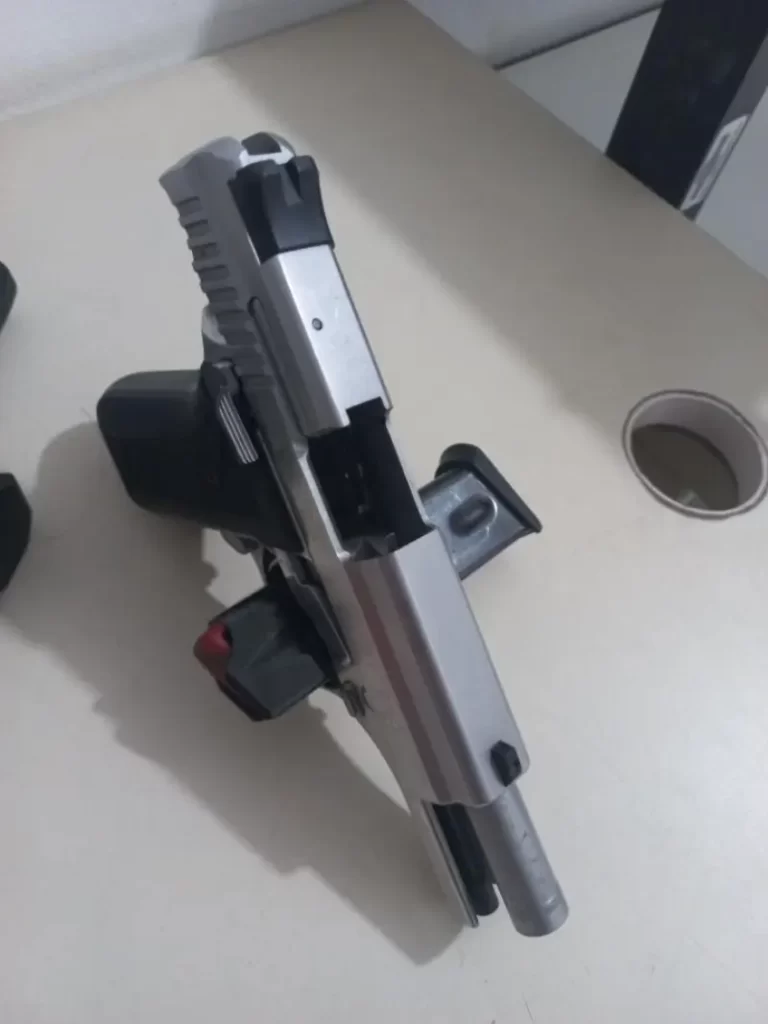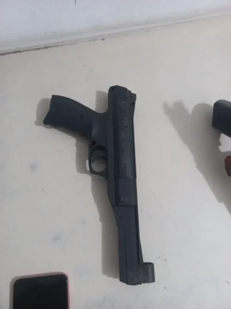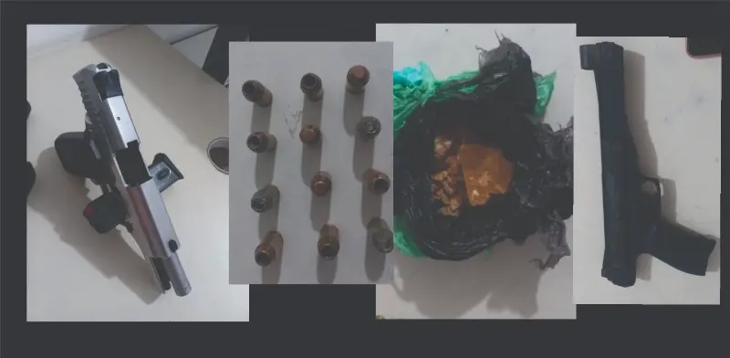 Durante a operação, os policiais avistaram, através de uma janela da residência, um torrão maconha, além de duas munições. Com base nessas evidências, a PM entrou na residência e conduzir buscas minuciosas. No interior do imóvel, foram localizados uma embalagem contendo crack e, no canto de um sofá, uma pistola de calibre .40, municiada com 10 cartuchos, totalizando 12 munições. Ademais, também foi identificada uma pistola de pressão e uma motocicleta que apresentava discrepância em relação ao número de motor, segundo informações fornecidas pelos agentes.