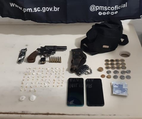 Diante dos fatos, foram apreendidas a arma, munições, drogas e os demais objetos. Os dois homens foram presos e conduzidos para a Central de Plantão Policial de Araranguá.