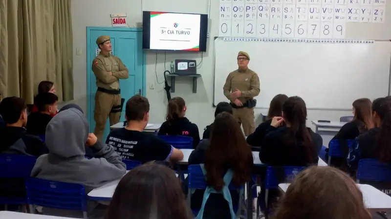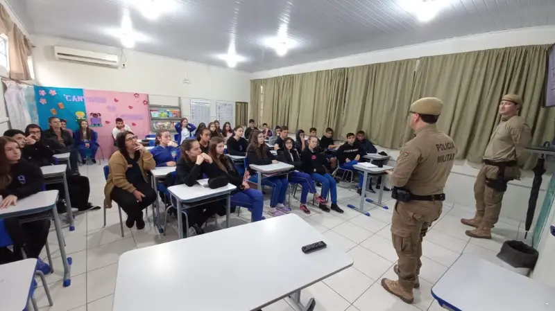 Em alusão à Semana Nacional do Trânsito, policiais da 3ª Companhia de Polícia Militar, ministraram palestra para as turmas do 8º e 9º ano no Colégio Dário Crepaldi, localizado no Distrito de Nova Roma.