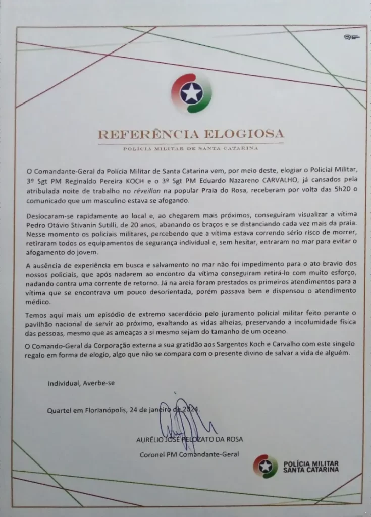 O caso que justificou o elogio dos sargentos, aconteceu no dia 1º de janeiro, quando os dois policiais militares que estavam sendo empregados na Operação Estação Verão, em Imbituba, realizaram o salvamento de uma vítima de afogamento na praia do Rosa. Após receberem informações via Central Regional de Emergência (CRE) sobre um homem se afogando, os policiais que estavam atuando na área do 34º Batalhão de Polícia Militar (BPM) para o emprego na Operação Estação Verão deslocaram-se rapidamente para a praia. Em poucos minutos, a guarnição avistou banhistas sinalizando o local do afogamento. Os sargentos Koch e Carvalho, agiram prontamente, entrando no mar e conseguindo salvar a vítima. Já na areia, os policiais prestaram o primeiro atendimento e o jovem se recuperou.