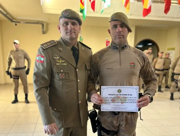 O Cabo Rodrigo Silva dos Santos foi homenageado pela Brigada Militar do Rio Grande do Sul, um reconhecimento à valiosa contribuição das ações humanitárias e de policiamento ostensivo durante as enchentes no Rio Grande do Sul.