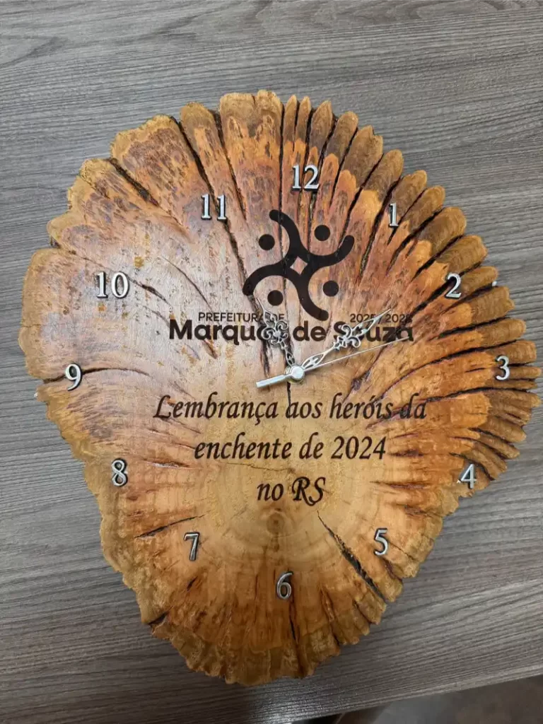 Durante o encontro, o Prefeito Fábio entregou um presente carregado de simbolismo: um relógio artesanal, confeccionado a partir de um tronco de árvore retirado das águas. A peça representa a força, a superação e o profundo agradecimento de Marques de Souza diante da tragédia.