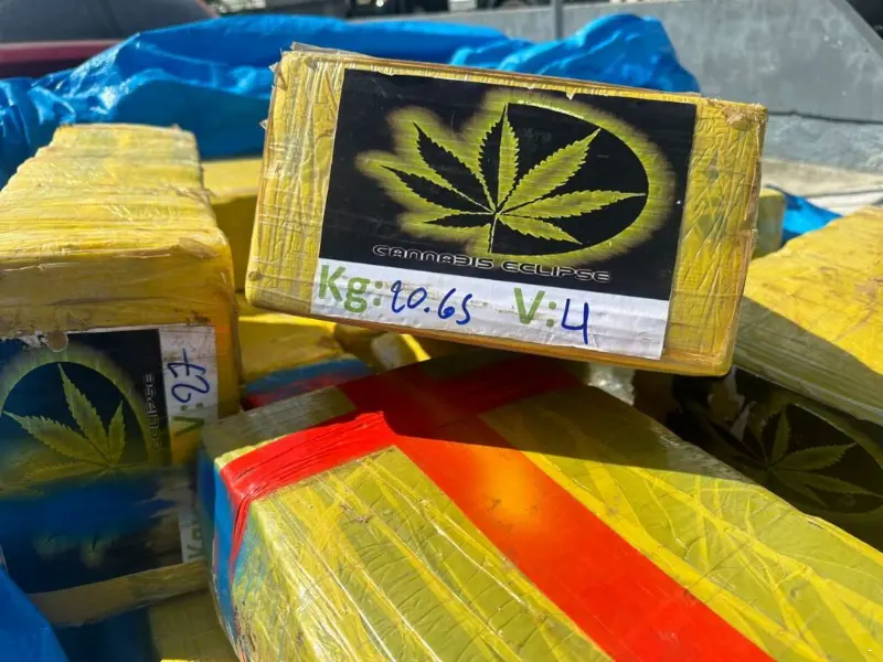 Tanto no interior do automóvel quanto escondidos debaixo de uma lona azul na caretinha, os policiais localizaram 28 fardos contendo “Cannabis Eclipse”, maconha oriunda do Paraguai, organizados cada fardo com o número do volume e o peso.