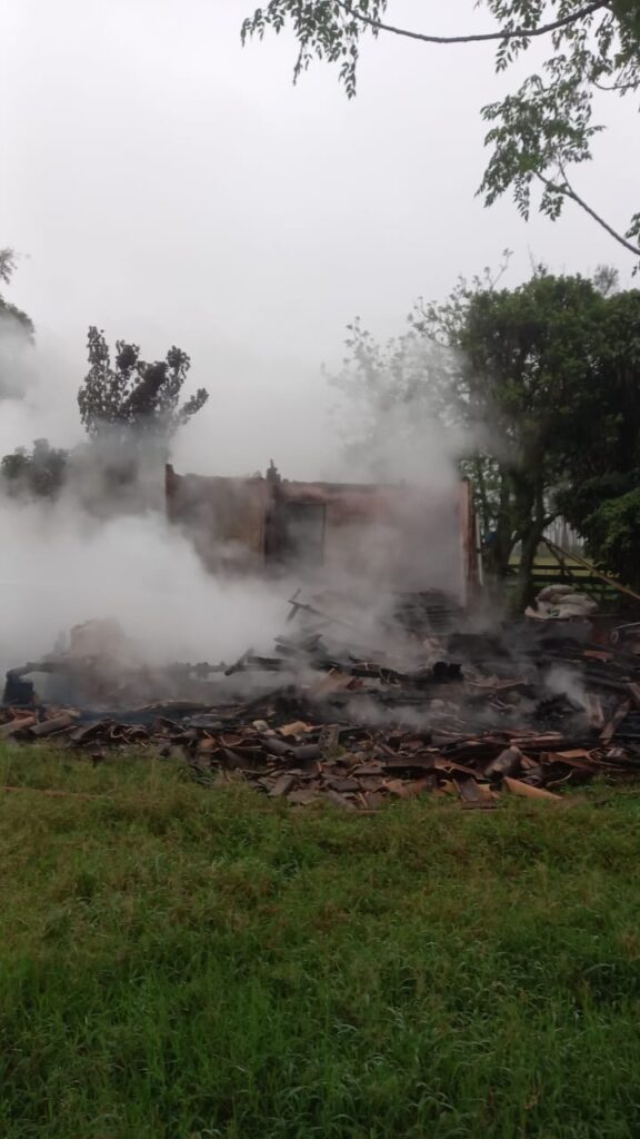 Uma residência foi destruída pelo fogo, na madrugada desta terça-feira, dia 26,. O Corpo de Bombeiros foi acionado por volta das 04h50 para se deslocar até o bairro Sanga da Toca, em Sombrio.