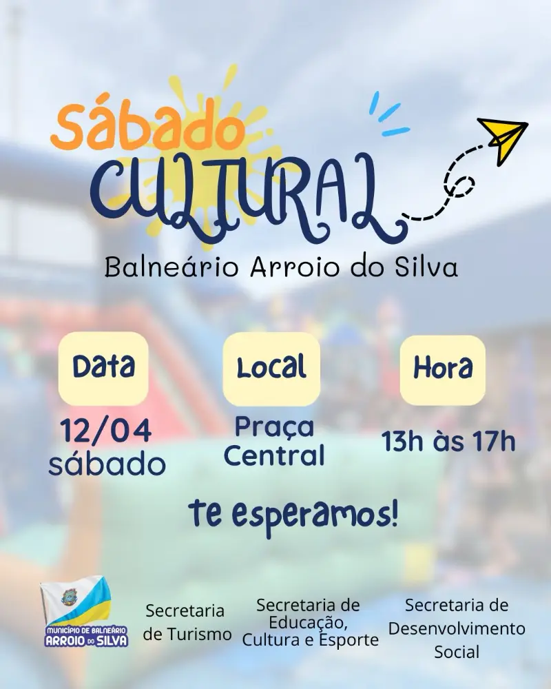Neste sábado, dia 12, das 13h às 17h, vai acontecer a primeira edição do ano do Sábado Cultural, na Praça Central de Balneário Arroio do Silva. Evento contará com feira de artesanato, feira de produtos da terra, brinquedos infláveis, apresentações, música e muita diversão.