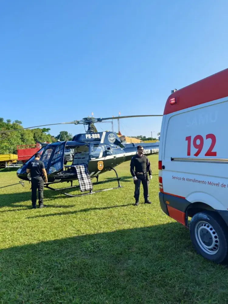 O SAMU solicitou a aeronave para fazer a transferência de uma senhora de 77 anos, com quadro de AVC isquêmico do Hospital Dom Joaquim de Sombrio para o Hospital de Criciúma.
