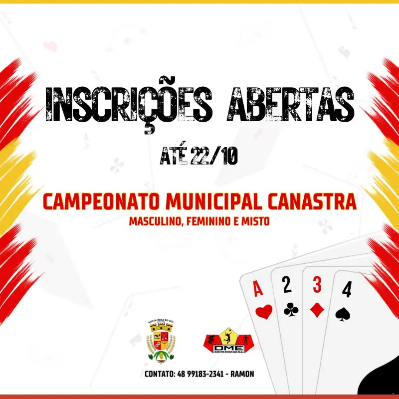 Atenção, mestres do carteado: o 2º Campeonato Municipal de Canastra de Santa Rosa do Sul já está com inscrições. O certame tem previsão de início para a próxima terça-feira, dia 22 de outubro e será disputado duas noites por semana.