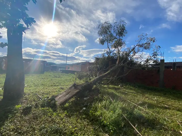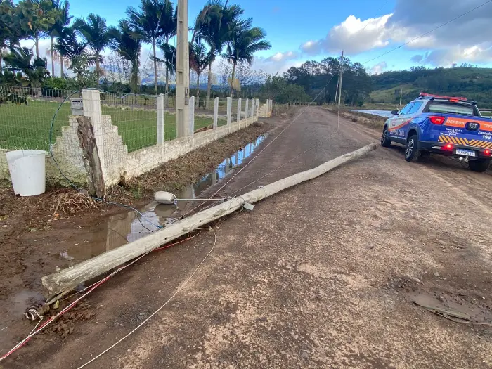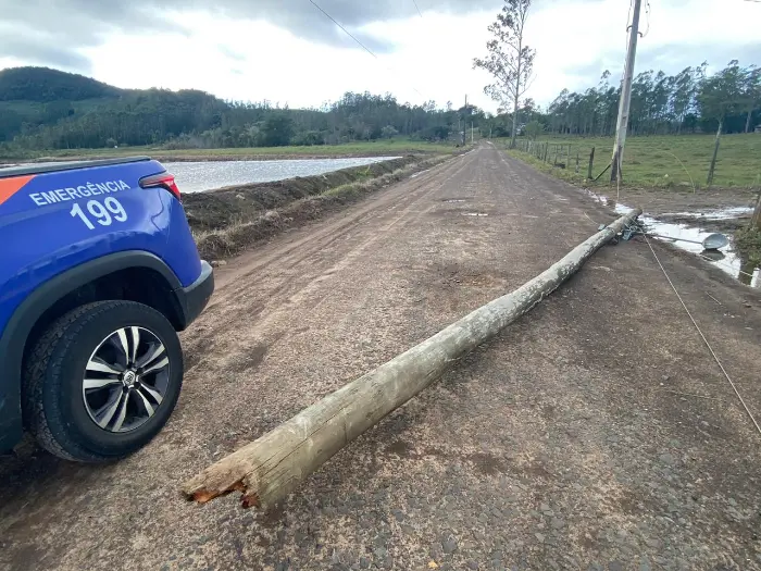 Postes caídos sobre vias nas comunidades de Vila Bitencourt, Pontão, Peroba, Sanga da Areia, Vila Nova, Parque Rosita e Centro.