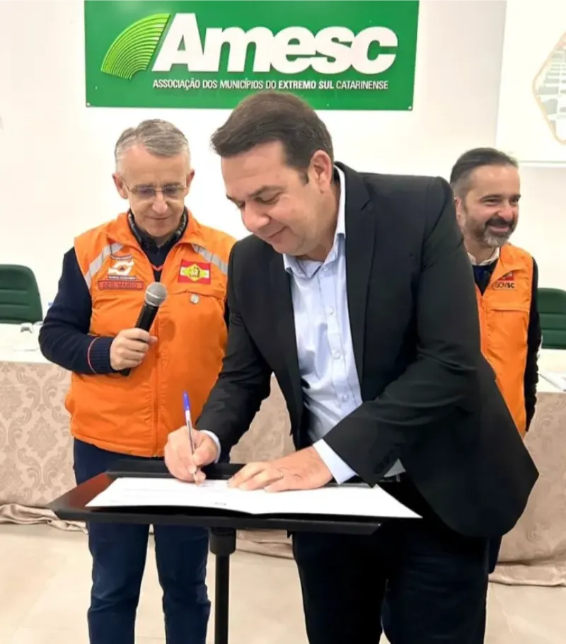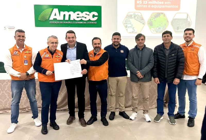 Nesta quinta-feira, dia 30, o secretário de Estado da Proteção e Defesa Civil de Santa Catarina, Mário Hildebrandt, esteve na AMESC acompanhado de sua equipe, para a assinatura de liberação de novos recursos destinados aos municípios da região.