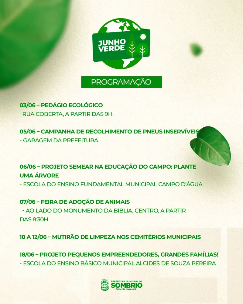 Com atividades diversificadas ao longo de todo o mês, a Prefeitura de Sombrio promove mais uma edição do Junho Verde – mês de conscientização para ações sustentáveis e em prol do meio ambiente. A programação é organizada pela Secretaria Municipal de Agricultura, Abastecimento e Meio Ambiente, com apoio de diversas entidades e escolas do município.
