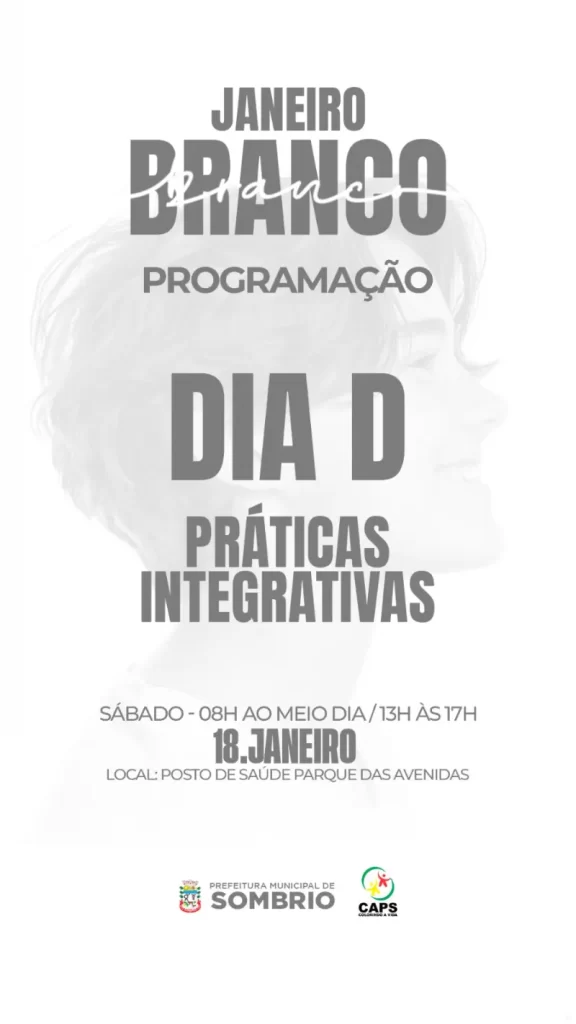 A Prefeitura Municipal de Sombrio realiza no próximo sábado, 18 de janeiro, o Dia D de Práticas Integrativas, dentro da programação do Janeiro Branco, campanha dedicada à conscientização sobre saúde mental e bem-estar emocional. O evento acontecerá no posto de saúde do bairro Parque das Avenidas, das 8h ao meio-dia e das 13h às 17h, com atendimento por ordem de chegada.