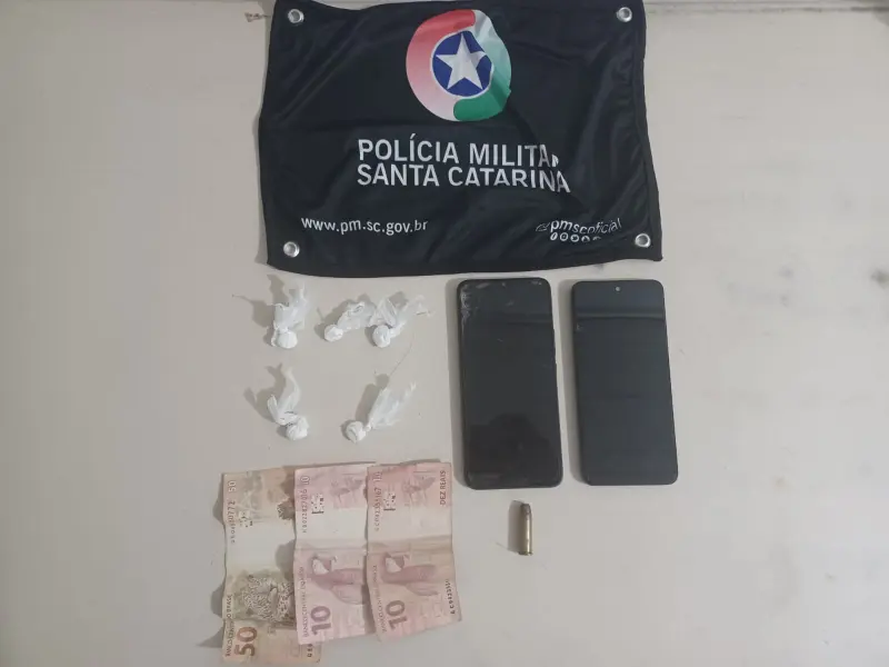 Durante a abordagem, a PM realizou uma busca pessoal e encontrou cinco porções de cocaína, totalizando 3,41 gramas, escondidas no tênis do suspeito. O homem afirmou ter comprado a droga de uma mulher conhecida no meio policial por tráfico, em uma residência no bairro Nova Brasília. Ele disse ter pago R$ 70,00 em dinheiro e o restante via Pix, utilizando uma cédula de 50 reais e duas de 10 reais. Um smartphone da marca Infinix também foi apreendido em sua posse.