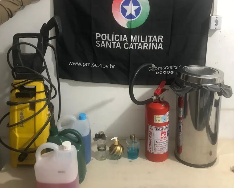 Com o suspeito, foram encontrados um lava-jato Lavor, uma lixeira de inox, uma escada de alumínio, um extintor de pó químico, três galões de produtos de limpeza e três frascos de sabonete líquido.