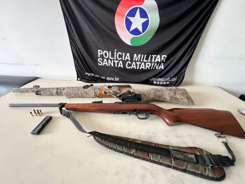 Após diligências, a guarnição localizou o suspeito, um homem de 39 anos, na casa de sua mãe. No local também foram encontrados dois galões com resquícios de óleo diesel e duas espingardas calibre .22, que teriam sido utilizadas para intimidar a vítima durante a ocorrência.