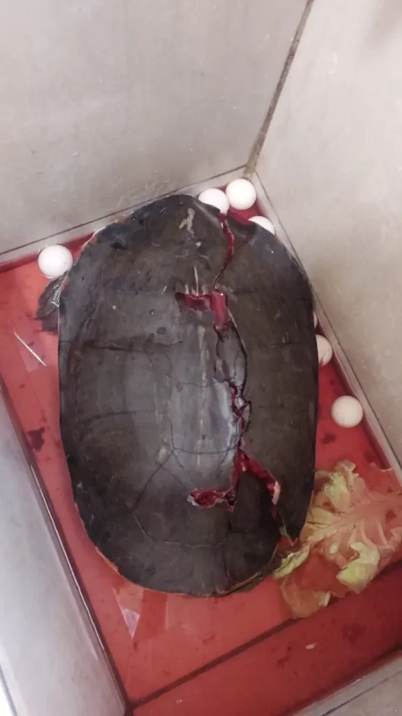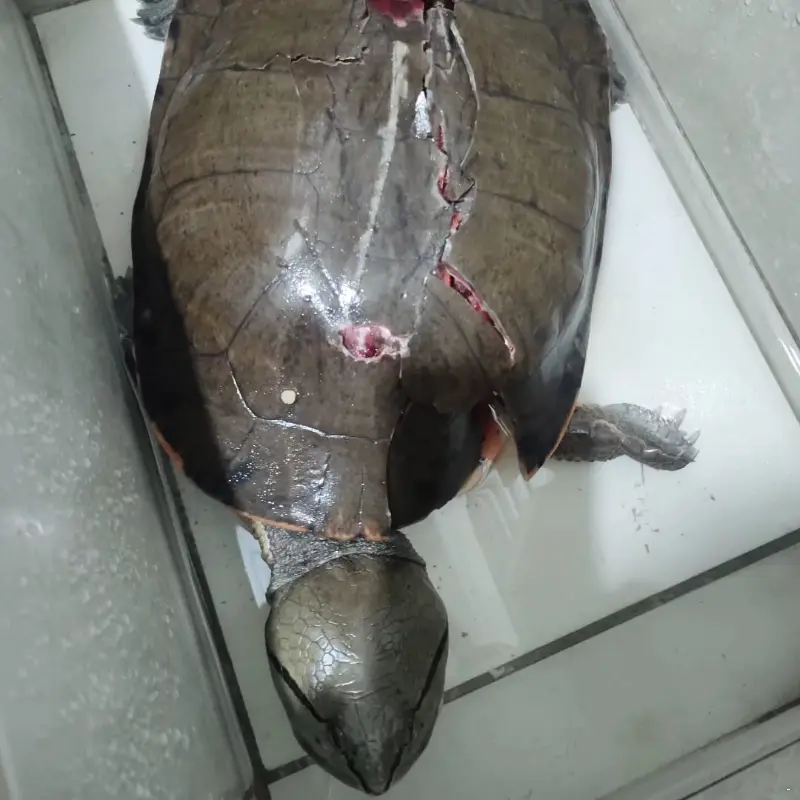 “Como chovia, o animal saiu da lagoa e veio para a estrada, sendo atropelada. O casco estava quebrado em várias partes e sangrava muito. Fiquei desesperada porque não queria deixar o animal vir a óbito. Depois de tentar ajuda da Polícia Ambiental e IMA, consegui contatar com a Educamar, que rapidamente veio socorrer a cágado. É muito bom poder contar com instituições que atendem os animais, neste caso era de água doce, mas não foi negado o atendimento”, relata à orientadora.