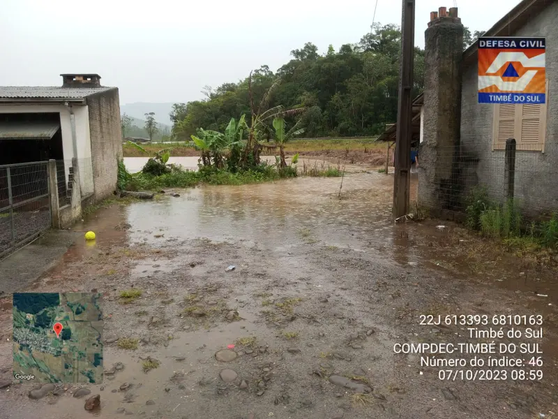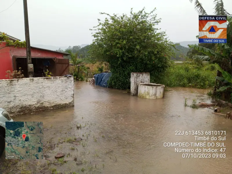 Timbé do Sul está em alerta junto de todo o estado de Santa Catarina. Conforme o pluviômetro instalado na frente da Prefeitura Municipal, nas íltimas 24hs choveu 110 mm. “No Centro choveu isso e nas cabeceiras chove mais. As calhas dos rios já estão colapsadas. Estamos alertas e de sobreaviso até passar este evento climático”, relatou o coordenador da Defesa Civil de Timbé do Sul, Evandro Amândio.