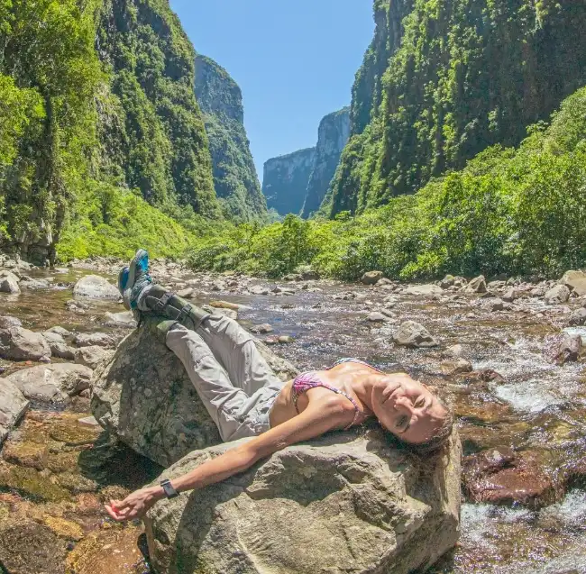 Com cerca de 14 km de extensão, a trilha é conhecida pelas paisagens imponentes dos cânions Itaimbezinho, cujas paredes chegam a mais de 700 metros de altura. Durante a caminhada, que pode durar até sete horas, os visitantes percorrem áreas com poços de águas cristalinas, cachoeiras, formações rochosas e a vegetação característica da Mata Atlântica.