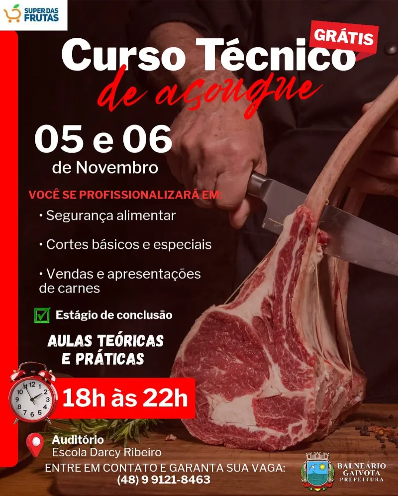 Em uma importante parceria entre o Mercado Super das Frutas e a Administração Municipal de Balneário Gaivota, será oferecido o Curso Técnico de Açougue de forma totalmente gratuita.