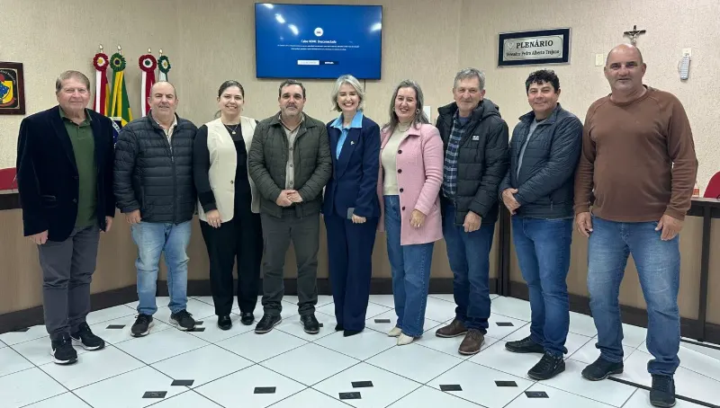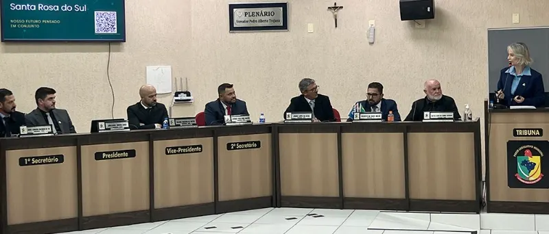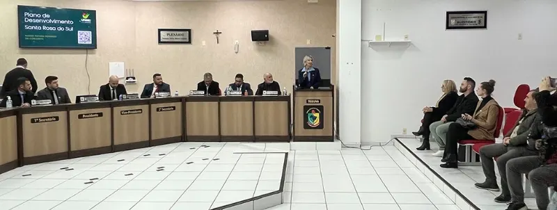 Tendo o prefeito Almides Roberg da Rosa e secretários municipais como expectadores, a sessão da Câmara de Vereadores desta semana recebeu a reitora da Unesc, Gisele Silveira Coelho Lopes, para apresentação de um resumo do Plano de Desenvolvimento Municipal, criado a partir de estudos da instituição de ensino. “Um projeto criado a partir de pesquisas, reuniões e a parceria dos cidadãos de Santa Rosa do Sul, com ações pensadas para o presente e para o futuro do município”, declarou a reitora.