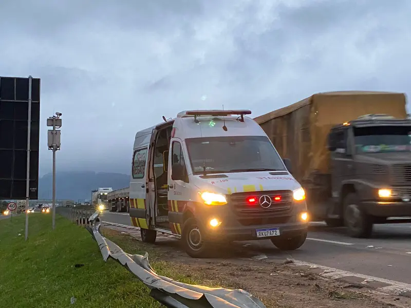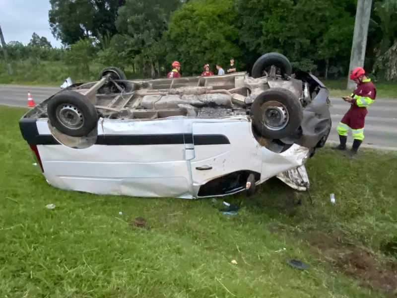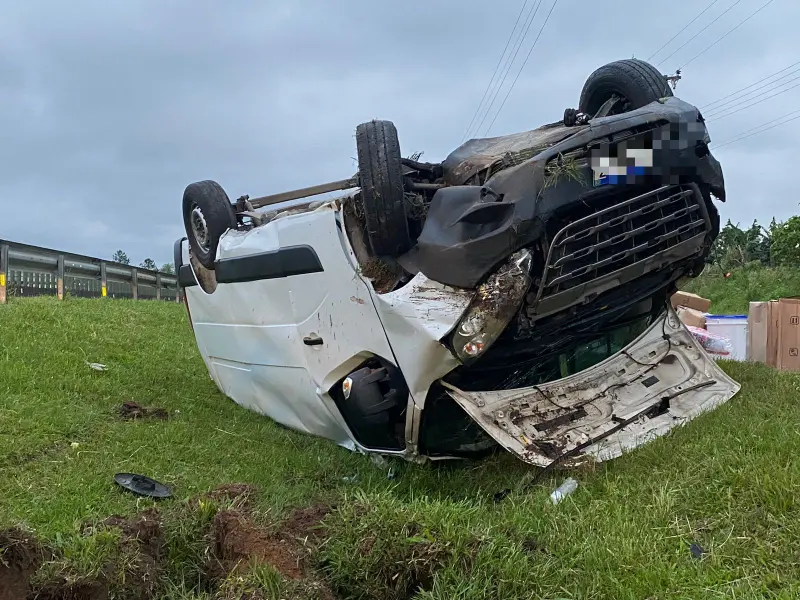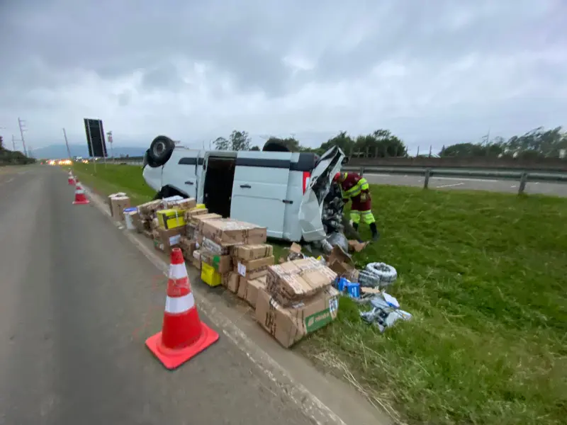 Por volta das 18h desta quarta-feira (23), a CCR Via Costeira atendeu a um acidente envolvendo uma van Renault Master que capotou na pista Norte-Sul da BR-101, próximo ao pardal no Morro do Português, em Santa Rosa do Sul. A van transportava peças automotivas quando um pneu traseiro estourou, fazendo com que o motorista perdesse o controle do veículo, que colidiu com o guard rail e capotou na margem da rodovia.