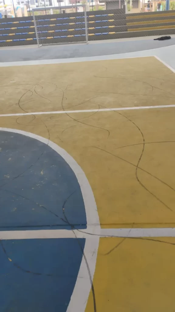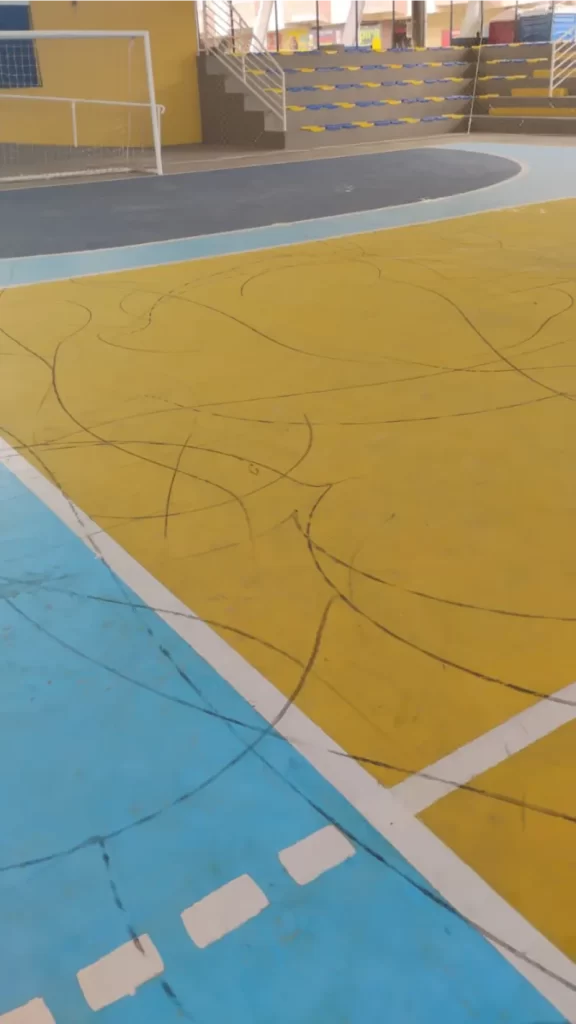 A equipe do Departamento de Esportes de Balneário Arroio do Silva se deparou, nesta segunda-feira (19), com uma cena lamentável: o piso da quadra central, que havia recebido nova pintura para receber os atletas e sediar competições esportivas, foi encontrado totalmente riscado, com danos em toda a sua extensão.